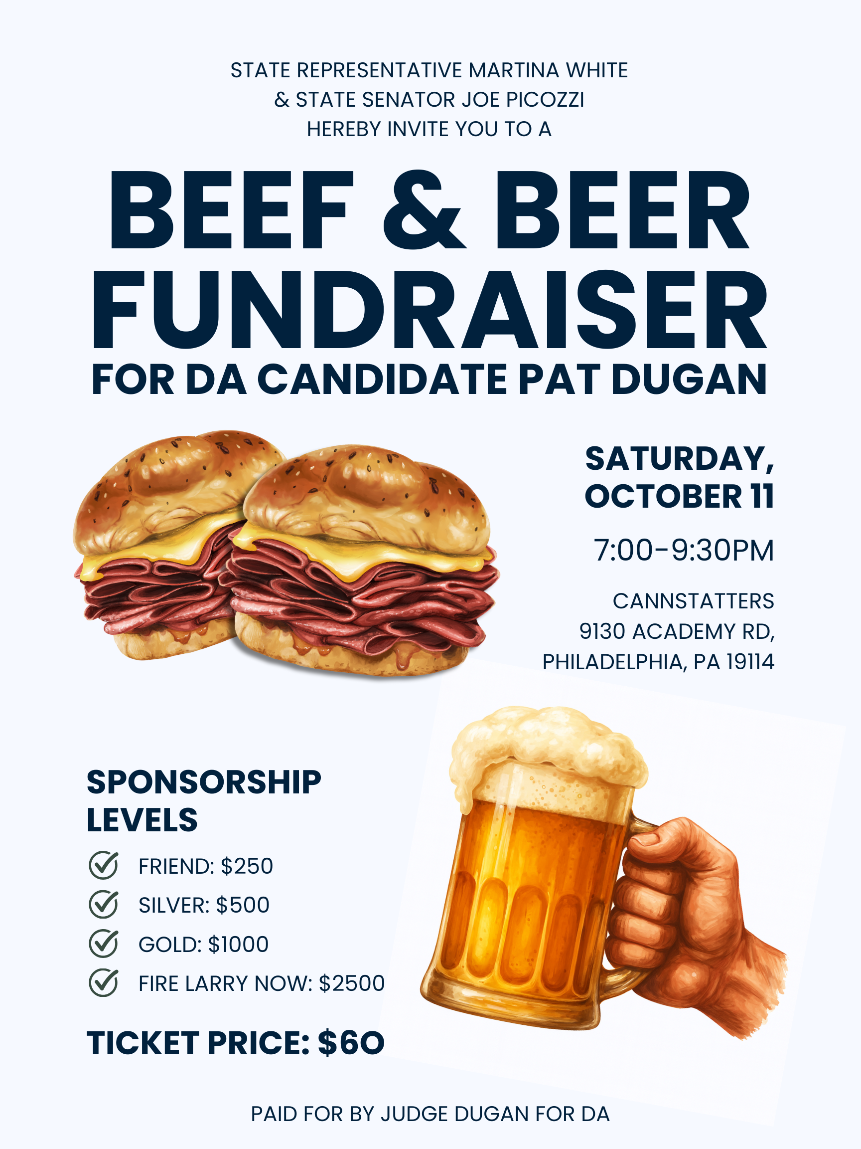 Enjoy a lively night of camaraderie featuring delicious beef sandwiches, cold beer, and spirited conversation as we rally behind Judge Dugan’s campaign for District Attorney.